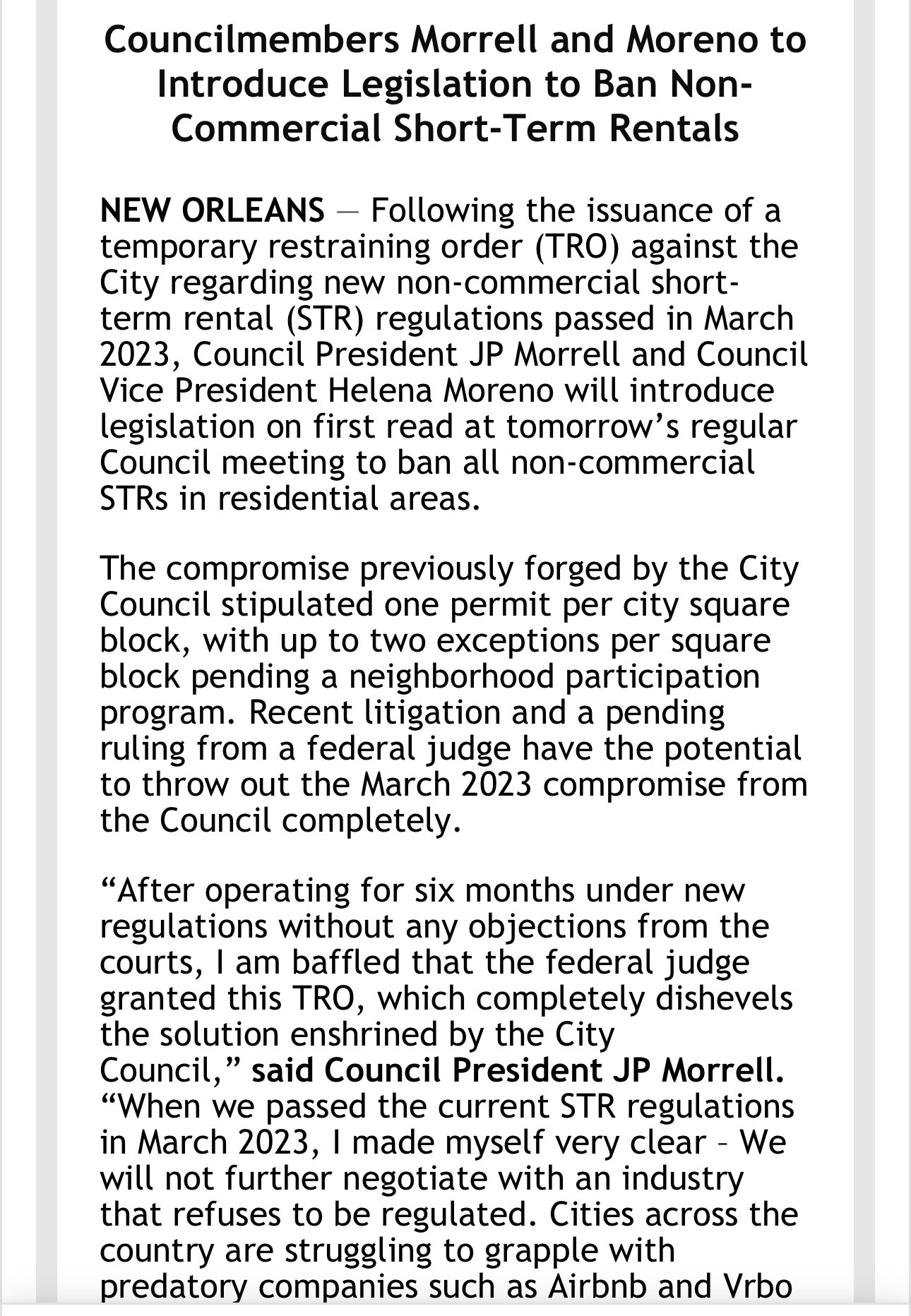 are introducing legislation to ban all residential short-term rentals in New Orleans. “We won’t allow corporations to overtake our neighborhoods. Therefore, I feel like the only choice left is to ban non-commercial STRs.