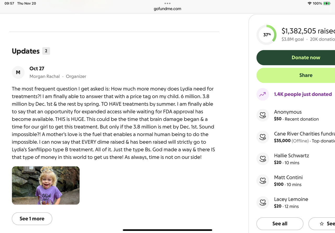 Yeah I don’t think their plan is to get into a clinical trial. The treatment is pretty far along in the development stage so it reads like they are hoping the treatment gets approved early 2026 and they’ll be able to access sometime later next year. Idk if I’ve ever seen a gofundme with as much money as this one.