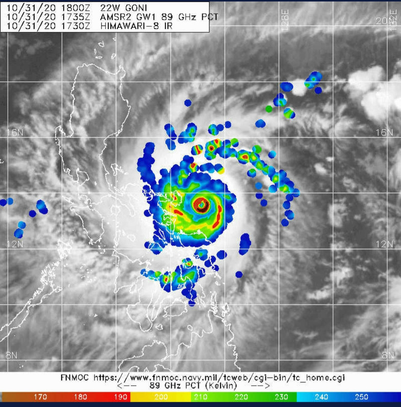 This AMSR2 pass of Typhoon #Goni is one of the most remarkable passes I've ever seen. Near perfect symmetry of very deep convection in the eyewall, with a prominent spiral band extending outward from the eyewall. My heart breaks for those in the path of this monster.