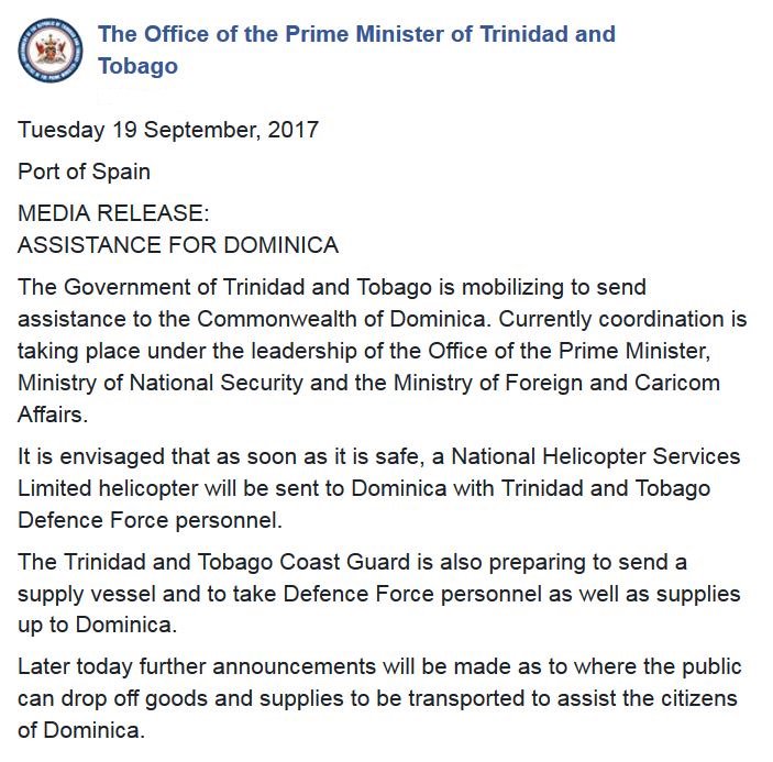Trinidad and Tobago also announce they are sending assistance. They are sending the National Helicopter Services Limited helicopters and the T&T Defence Force personnel.