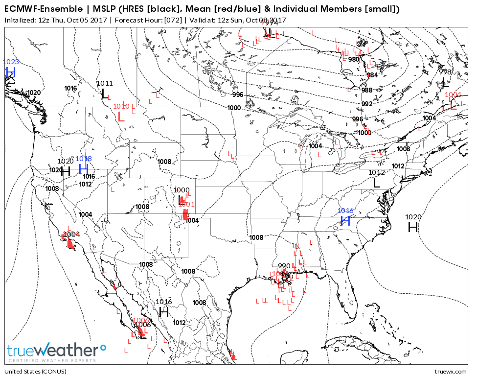 Euro ensambles. Little Ls show position of each member. Tight cluster on the SELa coast. Not sure of how much strength we are looking at.
