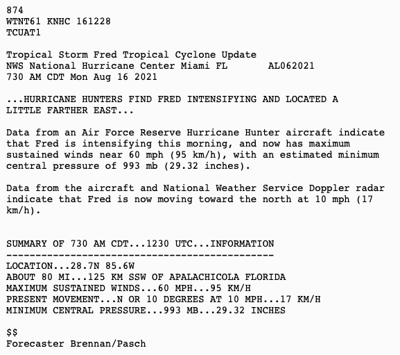 730 AM EDT: Air Force Reserve Hurricane Hunter aircraft indicate that Tropical Storm #Fred is intensifying, and now has maximum sustained winds near 60 mph.