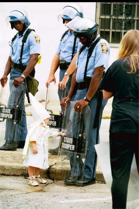 What yall wanna bet that the same person that gave the kid the water bottles told him to go give them to police also had the camera. Staged photo of the century
