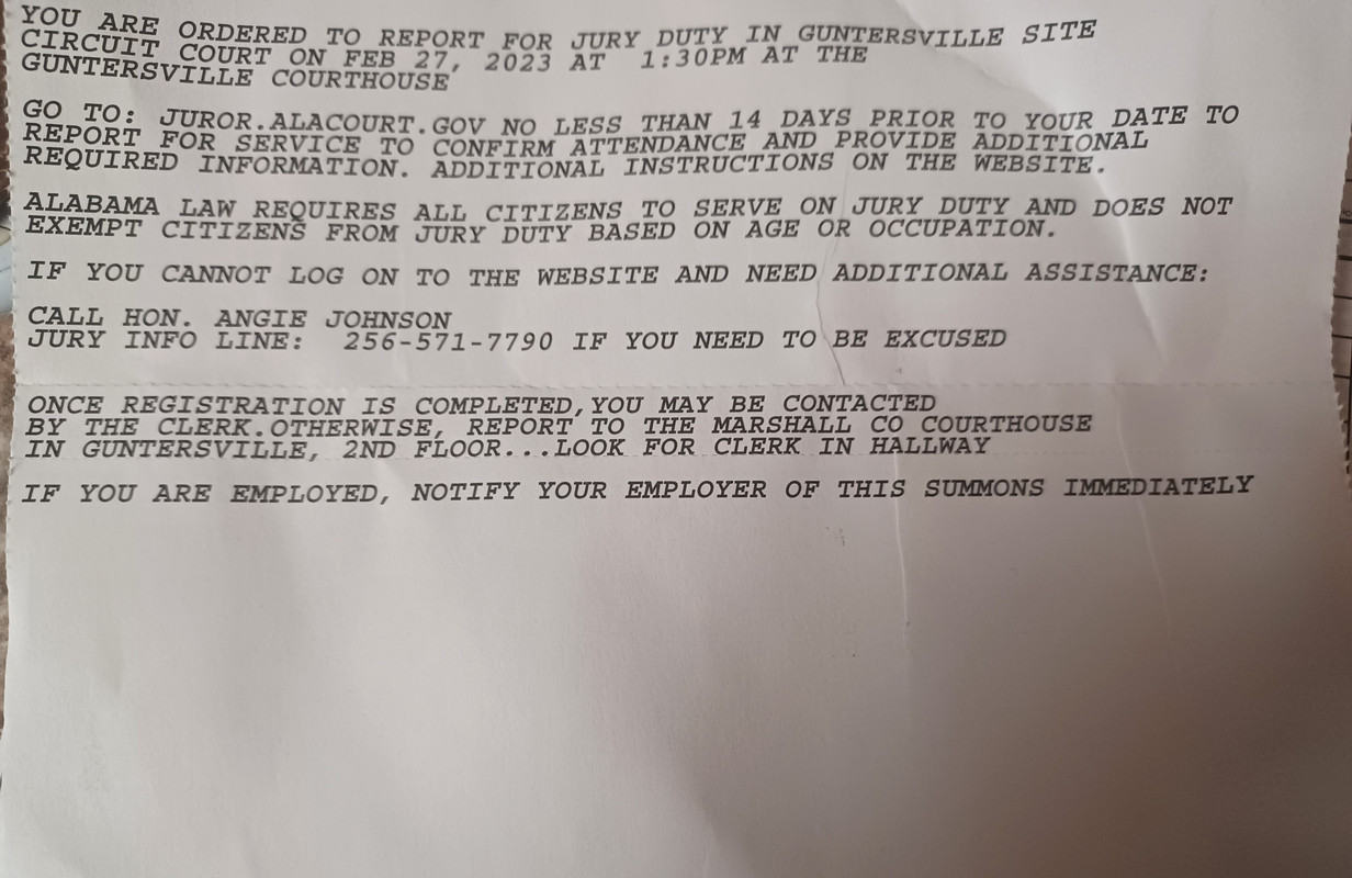 I got up and left the court room and stopped by the restroom on the way out. I had to pass by the courtroom to leave and when I did, everyone selected was walking out. The judge had just declared a mistrial...probably due to the jurors being tainted by everything the civil engineer said.