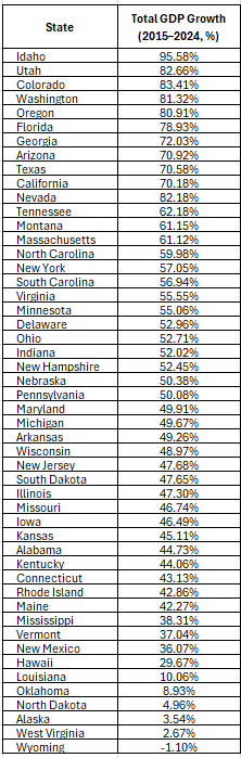 With the help of AI making a table the GDP growth rate by state for the last ten years was easier than I thought: