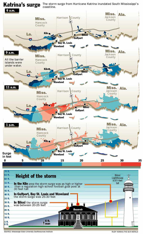 NOAA confirms surge of 25-28 feet along the Mississippi Gulf Coast and the storm hit at high tide.