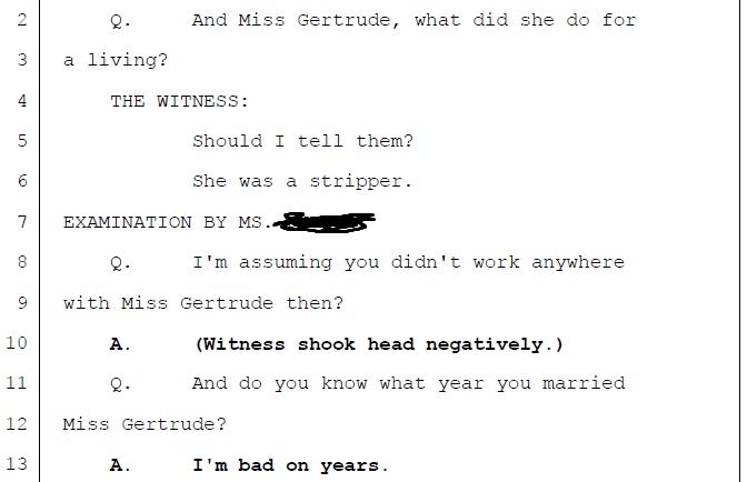 I'll share a couple of snippets of transcripts from sworn testimony. First, we have a gentleman being asked about an ex-wife: