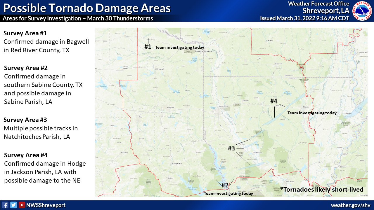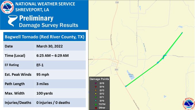 Our storm survey team confirmed today that an EF-1 tornado touched down yesterday morning near the Bagwell community in Red River County, TX. More storm surveys from yesterday's storms are still ongoing.