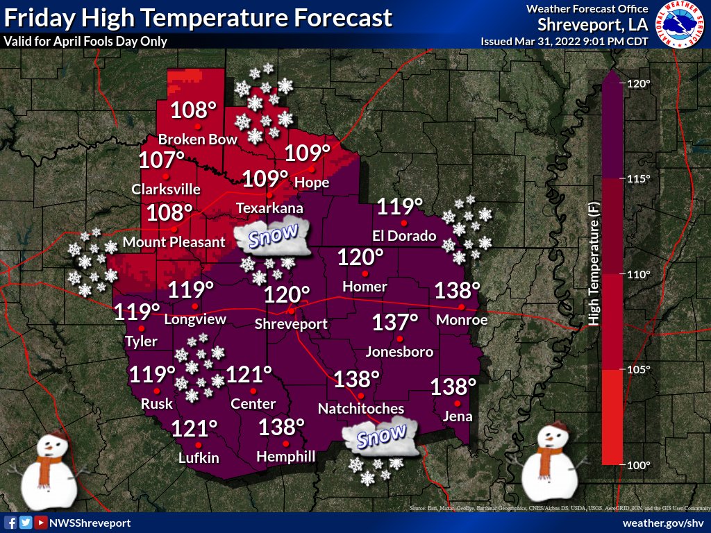 High temperatures for today, April 1st 2022, will range from 108° to 138° across the region. These temps will be achieved fairly early in the day, as a intense cold front rushes through this afternoon bringing an enormous amount of snow to the area. #AprilFools #NotARealForecast