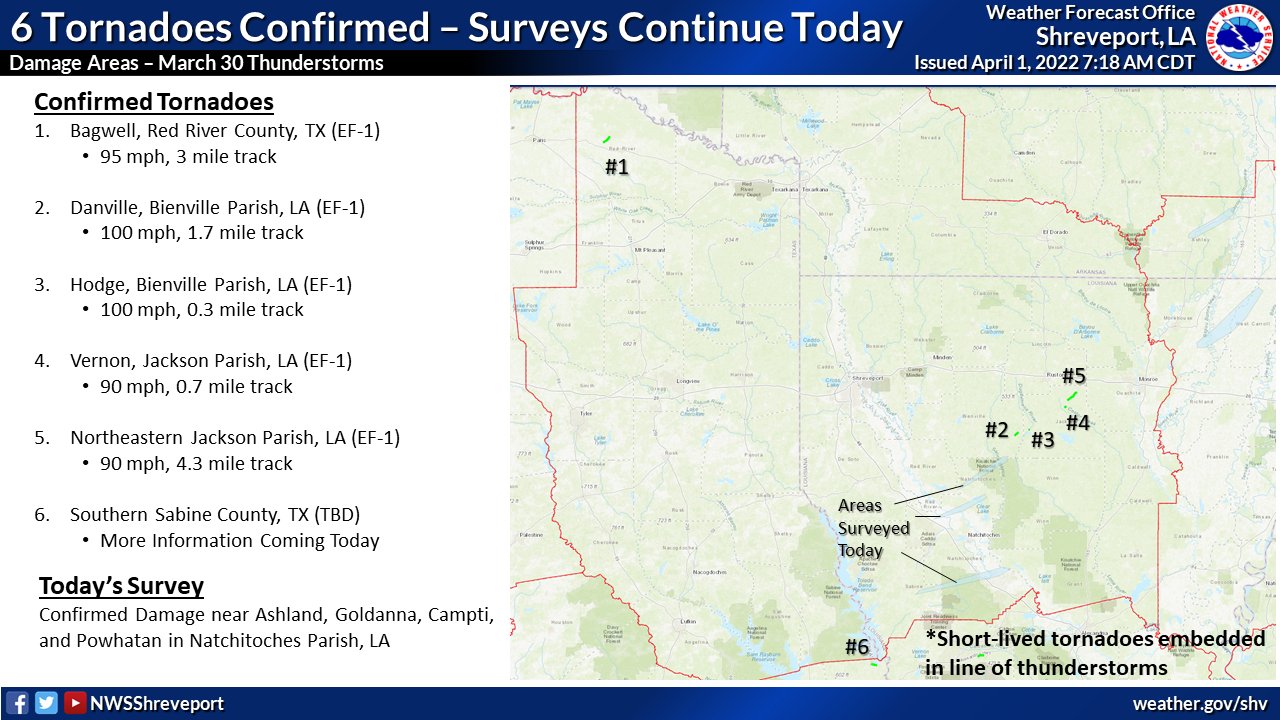 6 tornadoes were confirmed so far from March 30th in our area. There were 5 EF-1s and another confirmed tornado with a rating still TBD. A survey team will be out again today surveying several damage locations in Natchitoches Parish, LA. LINK