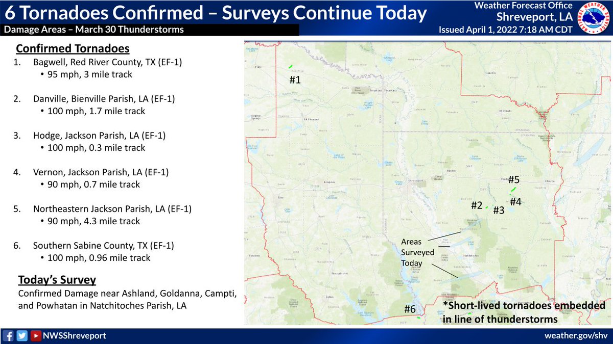[UPDATE] Six EF-1 tornadoes were confirmed so far from March 30th in our area. A survey team is out in the field again today surveying several damage locations in Natchitoches Parish, LA. #lawx #txwx