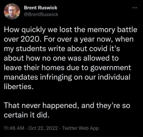 Yeah, the gaslighting of what was done to us in the name of The Science has been interesting to witness. Like lives weren't ruined and SWAT teams weren't sent after people walking by themselves in the wilderness.