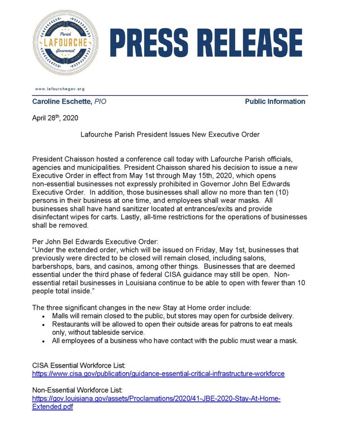 President Chaisson shared his decision to issue a new Executive Order, which opens non-essential businesses not expressly prohibited in Governor John Bel Edwards Executive Order.