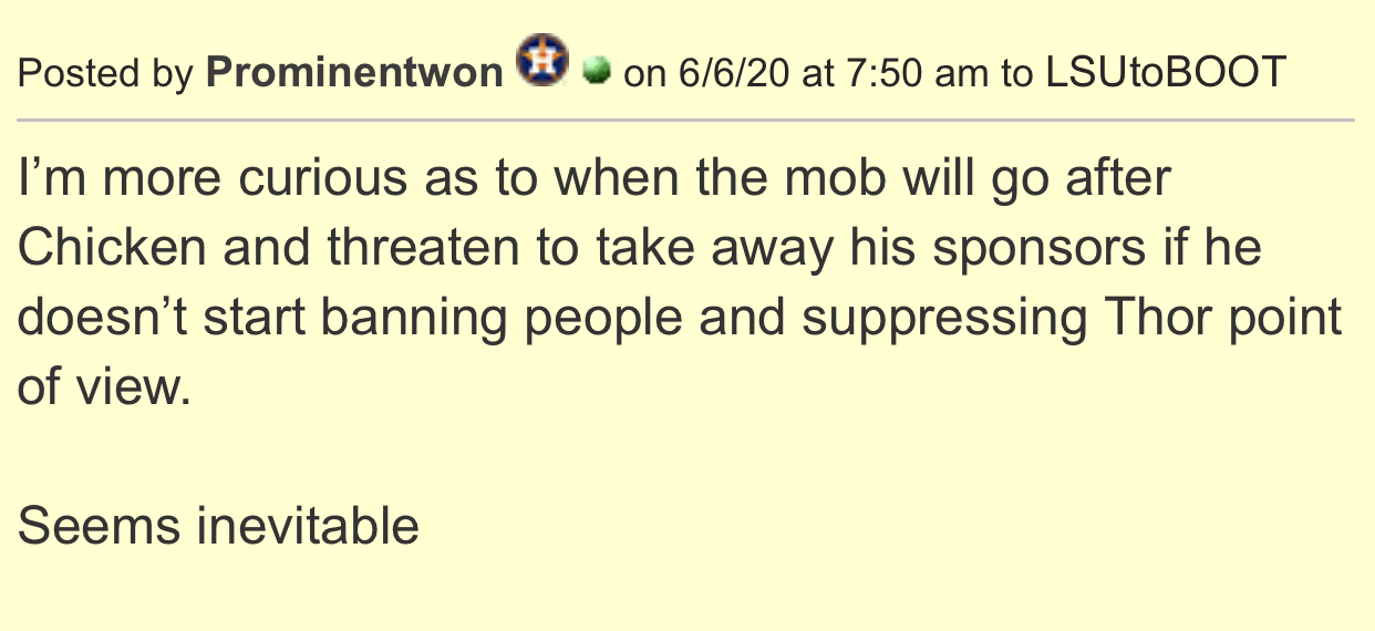 I don't see Chicken kowtowing to the leftist Twitter mob. He'd lose a lot of posters which create much of the content on this site.