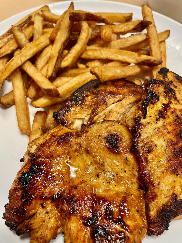 Grilled chic tits and tator stix.
