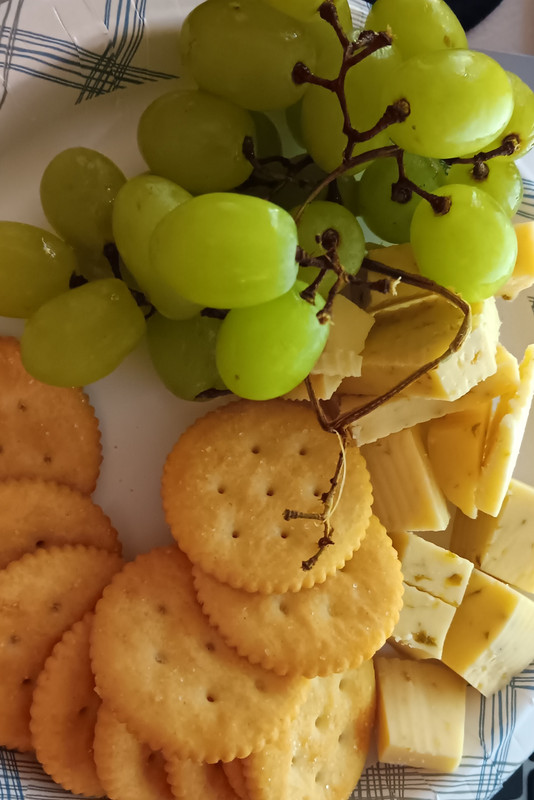 Lunch is ritz crackers and hatch chili gouda cheese with grapes