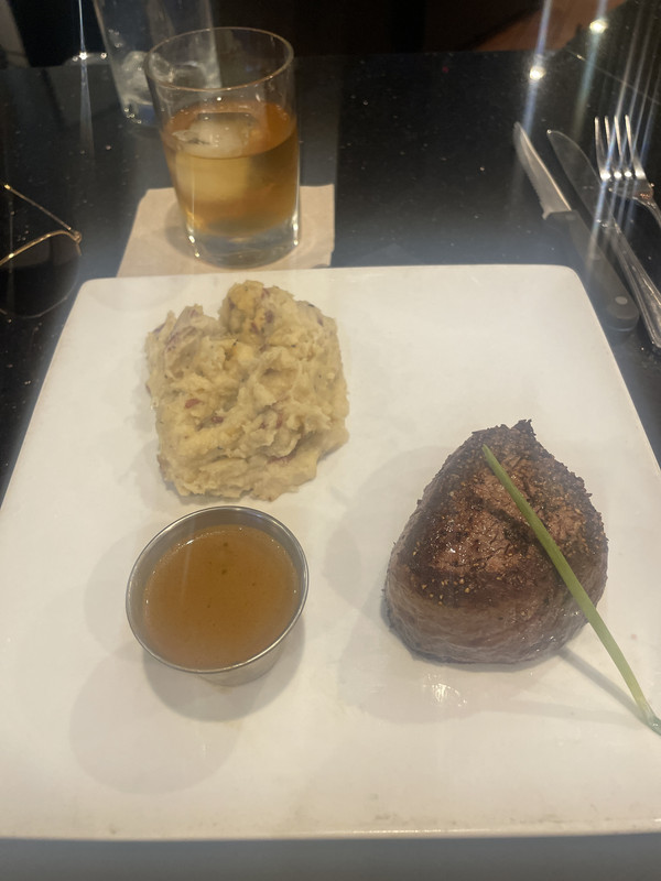 quote:Filet medium rare with garlic whipped taters and peppercorn sauce...plus another double Makers on a whiskey cube.
