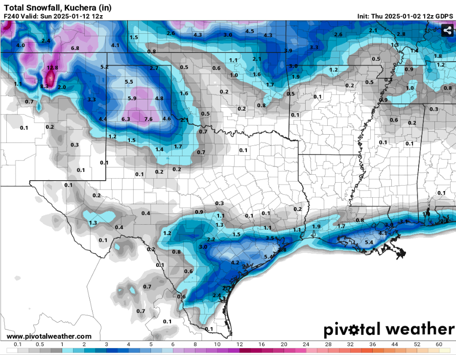 The GFS I'm looking at has me (North of Austin) getting about 10" - using Kuchera. 10:1 has me at 8".