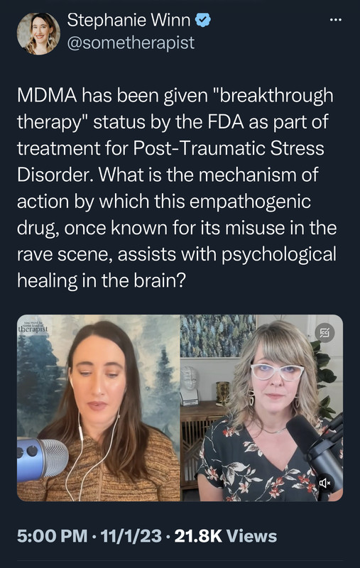 ETA: Forbes, Aug 28, 2017: FDA Designates MDMA As 'Breakthrough Therapy' For Post-Traumatic Stress