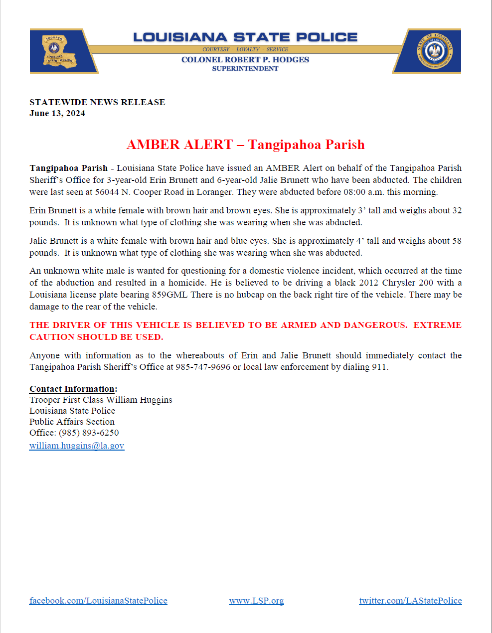 Anyone with information as to the whereabouts of Erin and Jalie Brunett should immediately contact the Tangipahoa Parish Sheriff's Office at 985-747-9696 or local law enforcement by dialing 911.