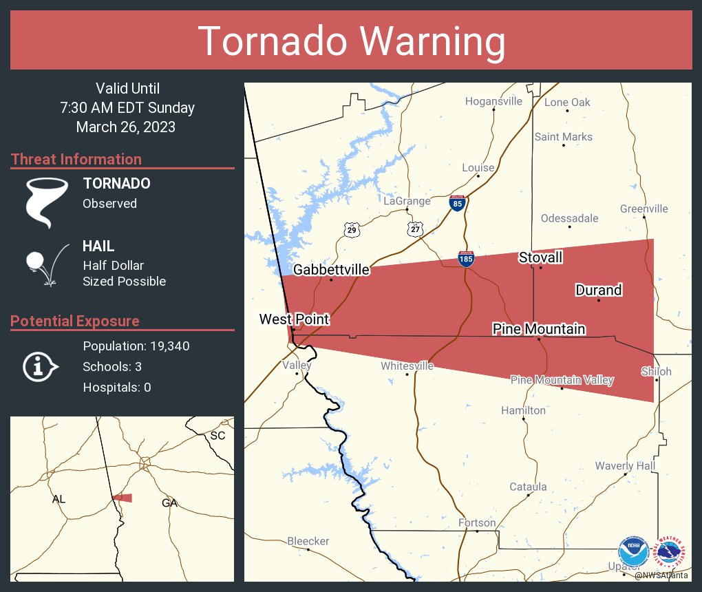 According local EMA - multiple injuries reported from the #tornado that moved south of #LaGrange this morning in #Georgia. Reports of homes leveled and closure of parts of highways I-85 and 185 closed due to trees and damage.