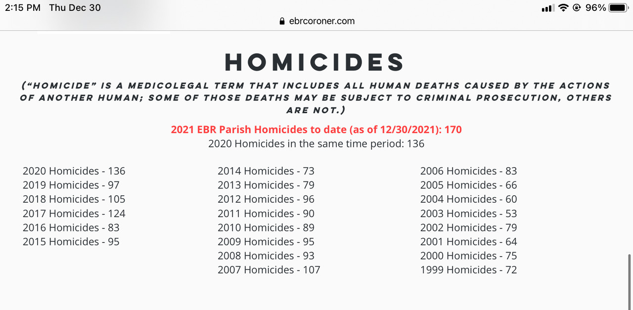 One might have been reported in NBR that was not reported by the news. Could’ve sworn even with the double homicide that occurred in Brookstown the number would’ve been 169, given the double homicide was classified as negligent when a juvenile was booked for killing his 74 year old father and another elderly guy during an alleged accidental shooting.