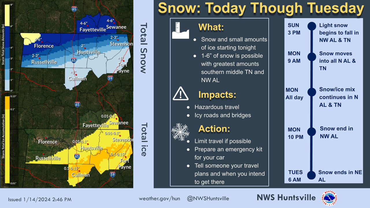 The Winter Storm Warning from NWS Huntsville now has the range from 2-6" (continues to go up for the top-end) of snow. Calls for some accumulation of sleet/freezing rain, around a tenth of an inch.