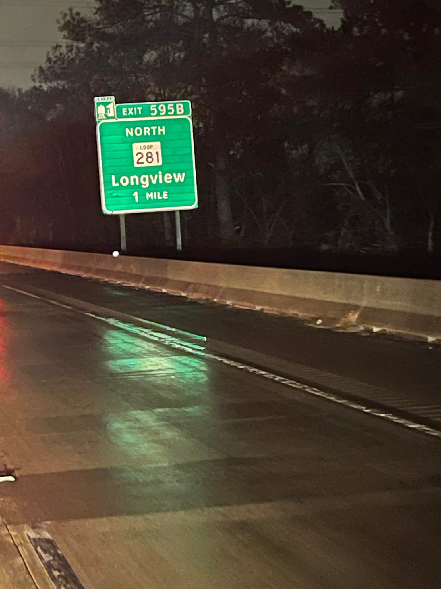 From Kelly Paramore “I20 Eastbound is a skating rink. We are at 281 N Longview Exit. 10mph, 22degrees”