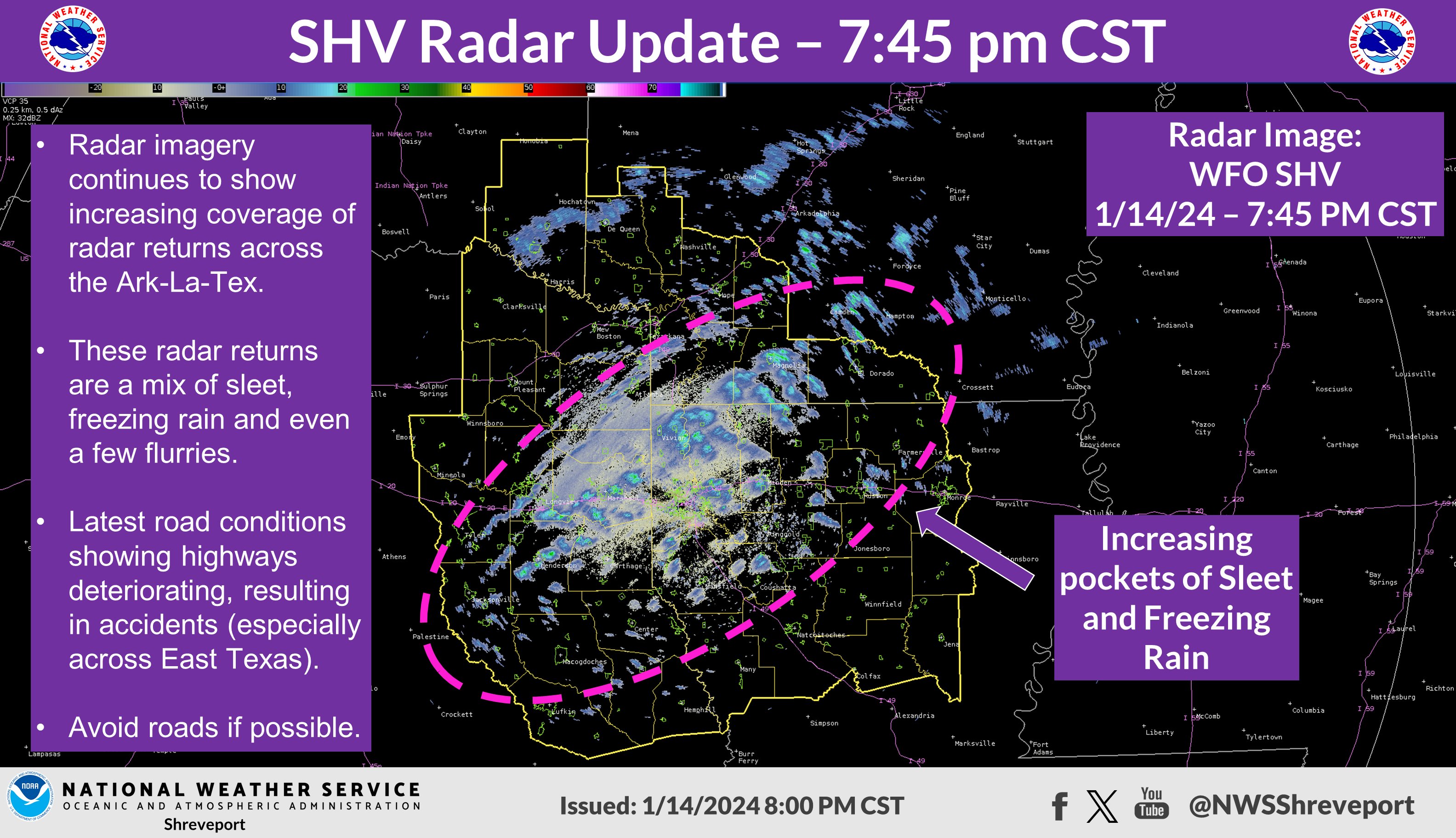 Pockets of freezing rain, sleet and some light snow flurries are increasing across the region this evening. As a result, roads are deteriorating and leading to accidents. This is especially true across the I-20 corridor in East Texas. Avoid driving if possible.