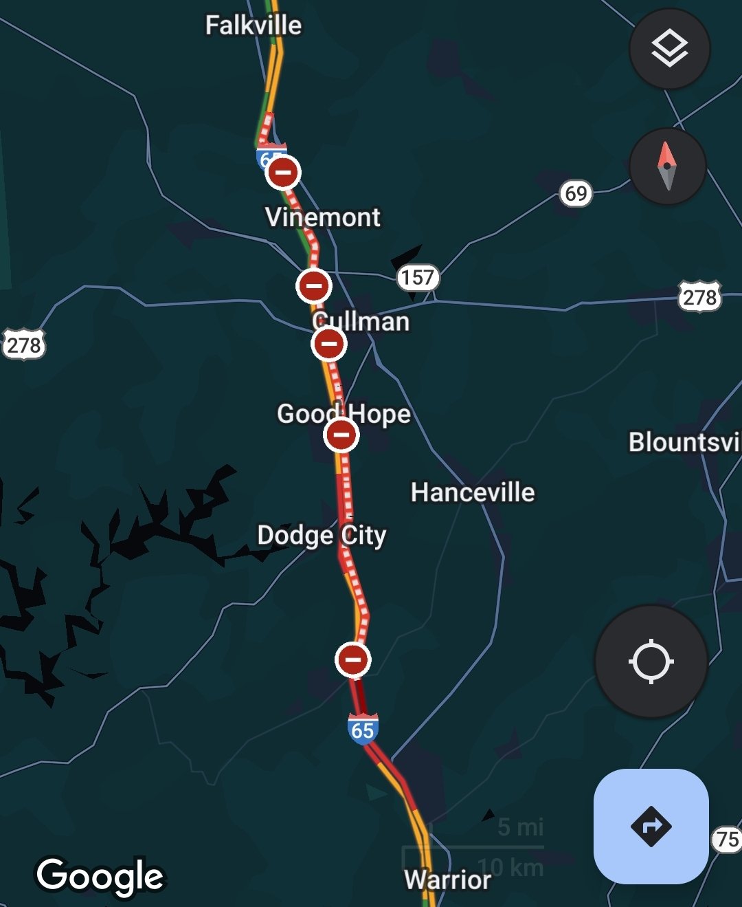 The area between Cullman and Lacon on I65 is a death trap even during the best of weather. Can't imagine how bad it is right now.