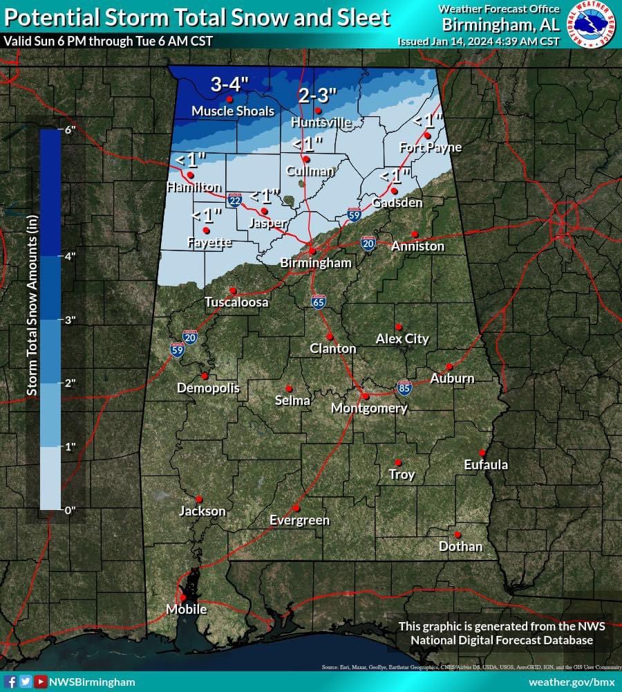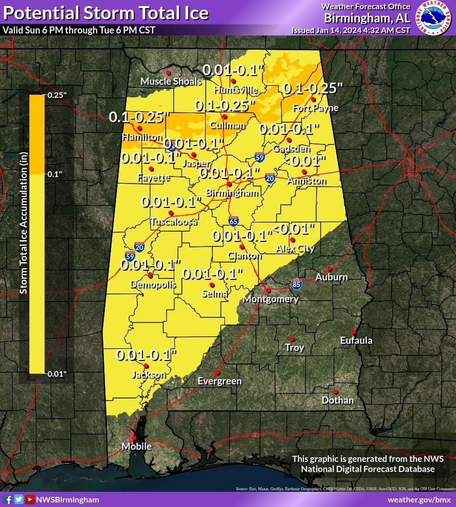 HRRR has ramped up the freezing rain totals across north and central Alabama, north and central Mississippi, southeast Arkansas and north Louisiana: