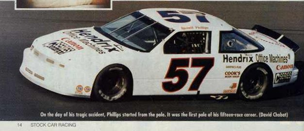 The crash occurred on lap 17 of the 67-lap event; up to that point, Phillips was in tenth place and had led three laps. His Oldsmobile was hit by the car of Steven Howard, who steered high to avoid a two-car spinout. Howard's car forced Phillips' car onto its right side, then smashed it roof-first into the retaining wall. Until 1996, NASCAR cars were not yet required to be equipped with the "Earnhardt bar", a roof-support bar running down the middle of the windshield, designed to prevent fatal roof collapse in roof-first accidents. His roll bars failed to protect the roof; both the roll bars and the roof itself were sheared completely off the car, exposing the interior of the driver compartment and grinding Phillips and the compartment against the wall and fence, killing him instantly. When the vehicle came back down onto the track on its wheels, there was a massive "gaping hole" where the roof had been.