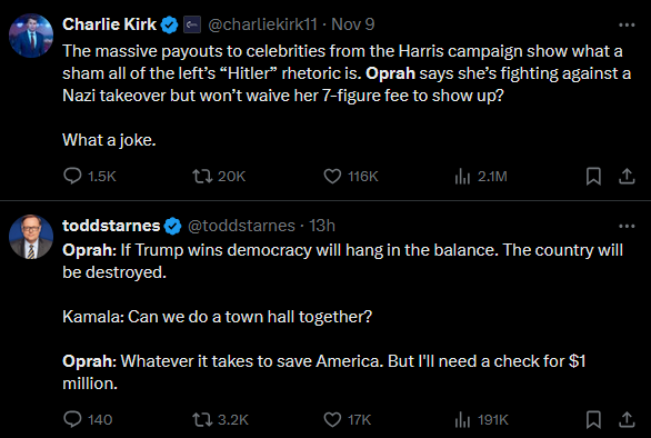 You can tell a lot about people when you see how Oprah makes a huge production out of giving away cars and money and all sorts of frivolous stuff to the audience in her shows. Trump, on the other hand, pays off people's mortgages, pays for education, pays medical bills, and gives substantial sums of money to people who are in great need and he never says a word about it. Therein lies the difference.