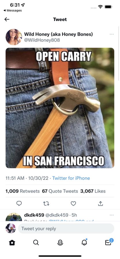 So we have an 85 year old man fighting an intruder over a hammer. Good job, Democrats.