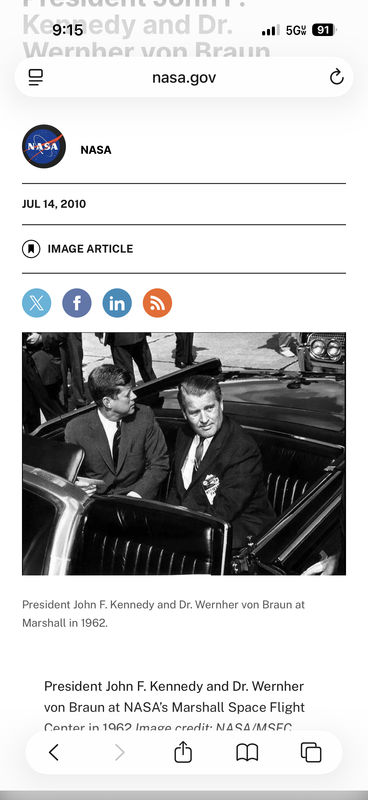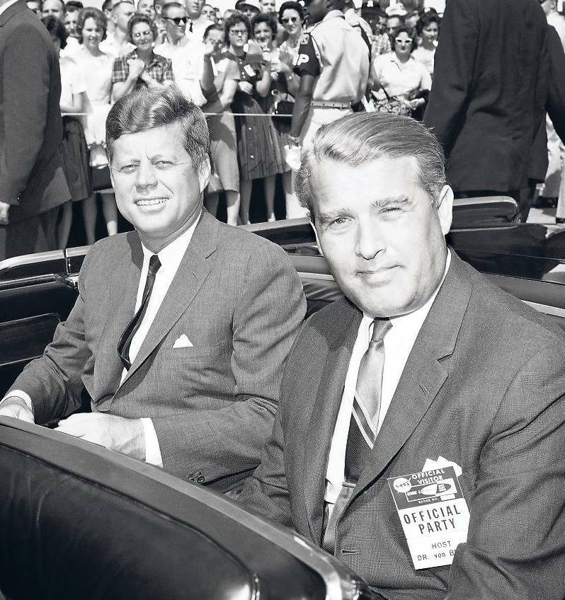Interesting photo-op. However it appears von Braun has been cut & pasted into the photo. Perspective is off.