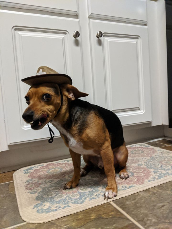 My son thought the dog looked funny with a sheriff's hat on his head. The dog wasn't particularly amused.