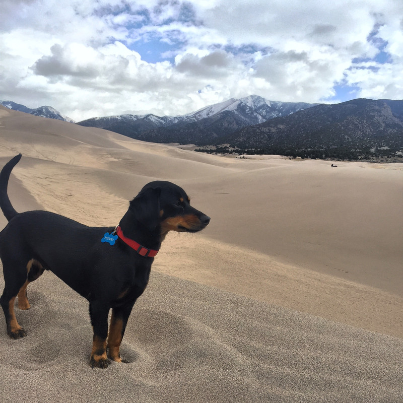 Mr. Henry Longtail hiking to High Dune at Great Sand Dunes National Park. 16 pounds of athletic wiener mix. Best $75 I’ve ever spent.