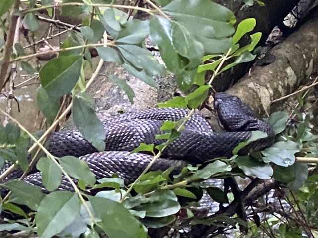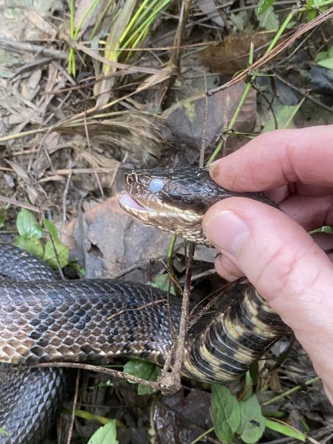 The one I caight today was ready to shed, so it was practically blind. Most snakes are very defensive when they are in shed due to this. This one was sitting on a branch. I got my snake hook under it and lifted it off, but it sropped into the water. I was able to get it on my hook again and put it on land. The whole time it kept trying to flee, which made it hard to get photos and video.Not once did it strike. Eventually I was able to catch it, get a photo, and release it.