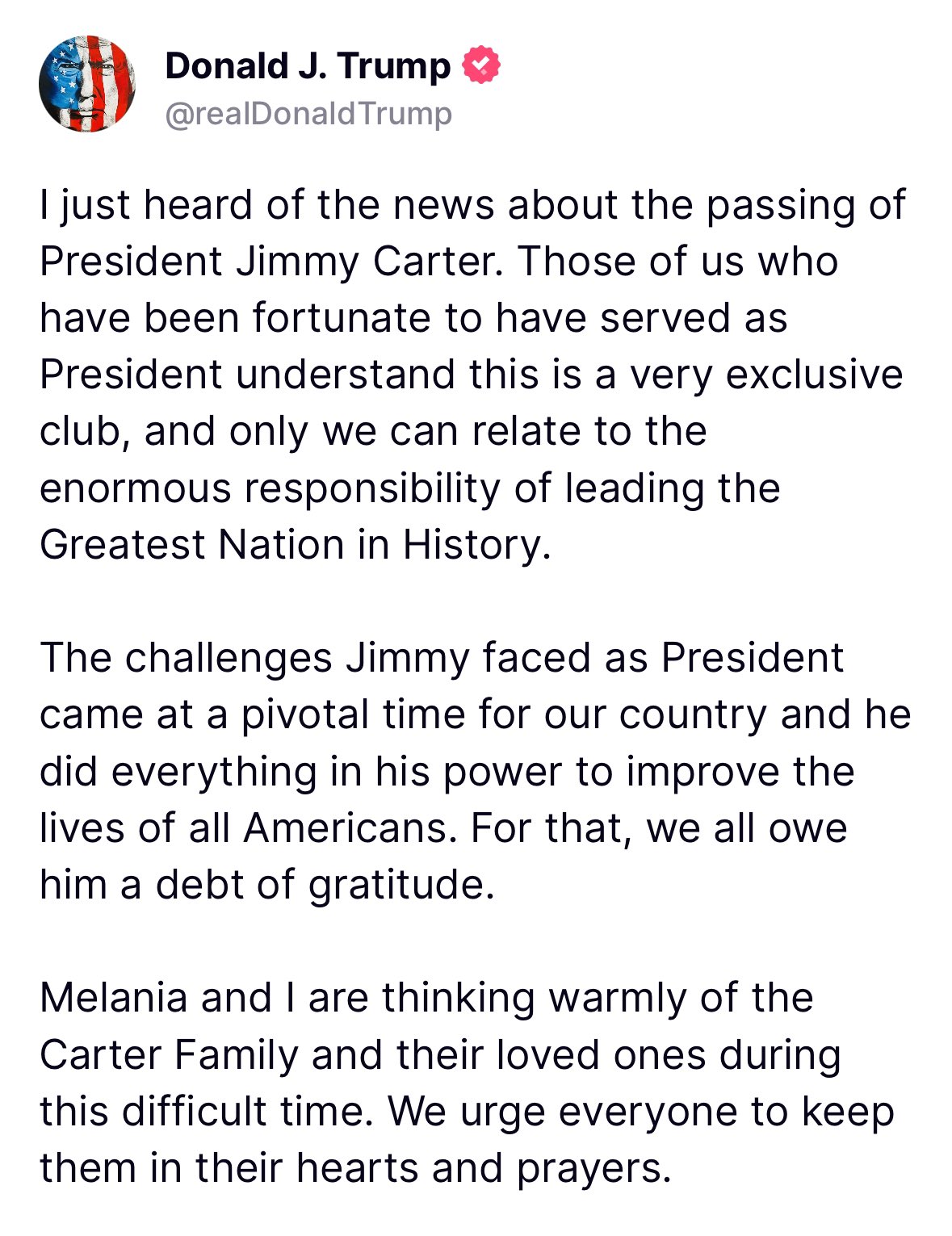 Let he who is without sin cast the first stone. The man, Jimmy Carter, was a fine man who let his work reflect his beliefs and principles. He walked with the Lord and for that he deserves my respect and condolences. Rest in Peace Mr. President.