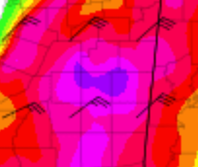 Significant tornado parameter at peak on Saturday. Widespread 4-5 out of 10 and peaks of 9/10.