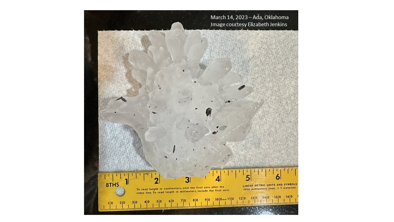 This 5.25 inch diameter hail stone fell in SE Ada OK on 3/14/24. It's a new record for the largest stone reported in Pontotoc County since 1950 (old record was 3.25" near Francis 3/26/2017). It's also the largest in OK since 5/23/2011, when 6" hail fell in Caddo County.