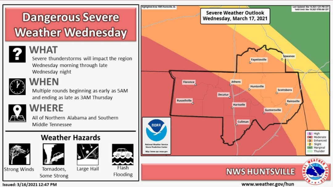 [1 PM] Confidence continues to increase that a long duration, widespread severe weather event is likely tomorrow across the area, with damaging winds, large hail, and tornadoes. A few tornadoes could be strong and long-tracked. Please stay tuned and make preparations now. #HUNwx LINK