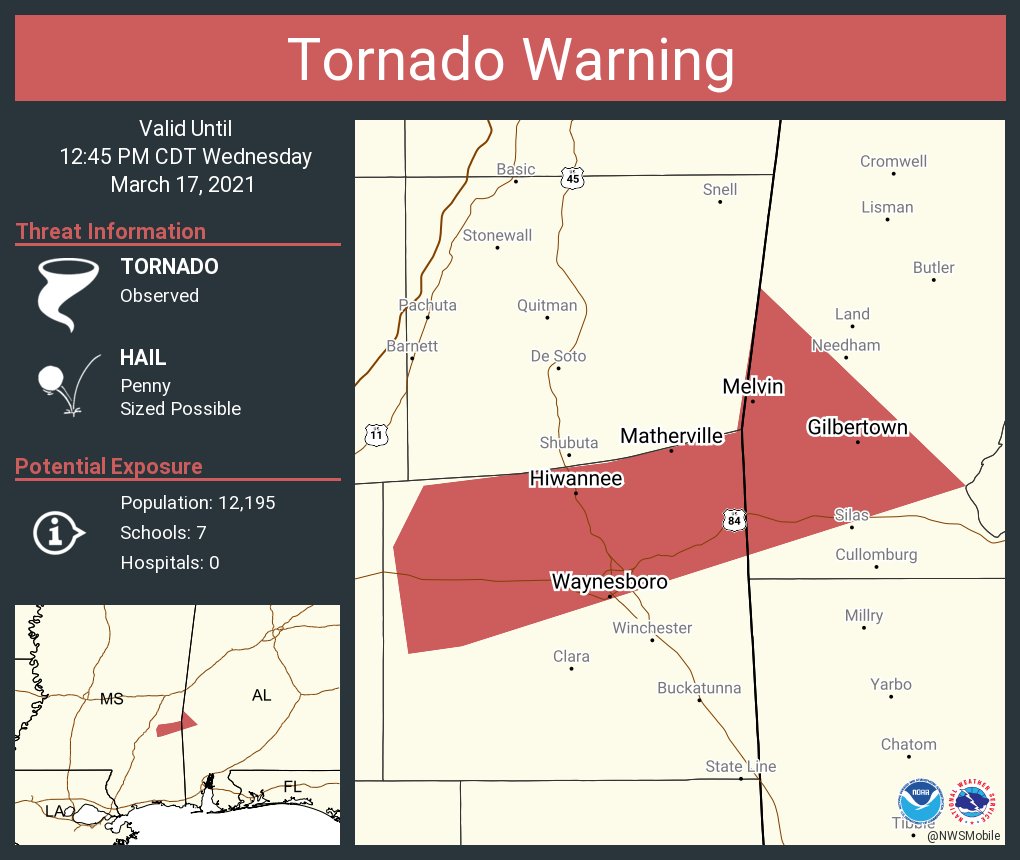 OBSERVED TORNADO: At 1207 PM CDT, a CONFIRMED tornado was located near Mill Creek, or 13 miles west of Waynesboro, moving northeast at 35 mph. SEEK SHELTER IMMEDIATELY! #MSwx