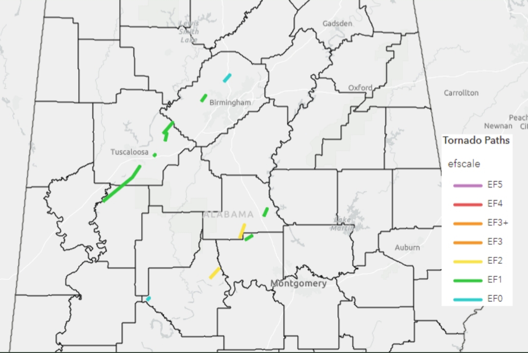 PRELIMINARY. This tally WILL go up. We stand at 11 confirmed tornadoes from Mar 17. We are still working on data tonight and have several more areas to survey this weekend. Strongest: 2 EF2 (yellow line). Longest path: 22 miles (Hale to Tuscaloosa County). LINK