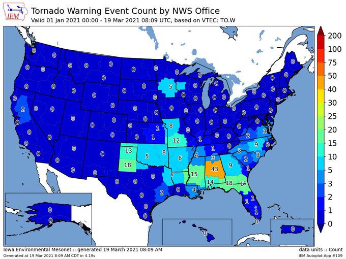 Wanted to share this and figured this thread was a good place for it as we look back at this event. This is the number of tornado warnings issued so far this year by National Weather Service office. So far NWS Birmingham has the big lead.