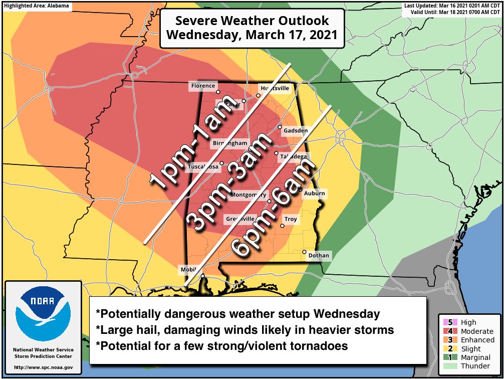 I didn’t post this this morning, but here is the threat graphic from the NWS in Birmingham for the counties they cover. Note the “strong long track tornadoes” wording for the moderate risk.