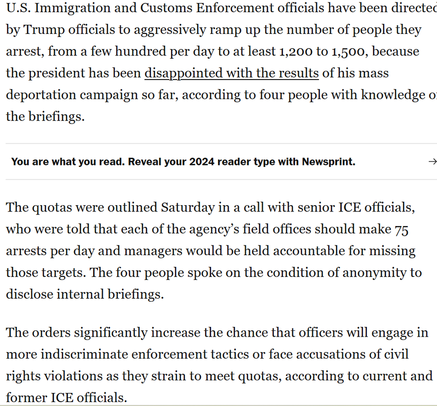 Every article I read pushing this has still had to mention it would be less dangerous or non dangerous illegals with some at most having a “legal” status as a pending claim in court system (which were handed out like candy by Biden’s keeper before illegals disappeared themselves) and/or Biden’s attempt to fast track provisional residency for many illegals (which Biden’s keeper also overreached and abused). No mention of fearful naturalized citizens or possibility of it happening to naturalized citizens. Even with those two they offer no proof but are just pushing possibility due to a quota story that also has zero independently verifiable sources.
