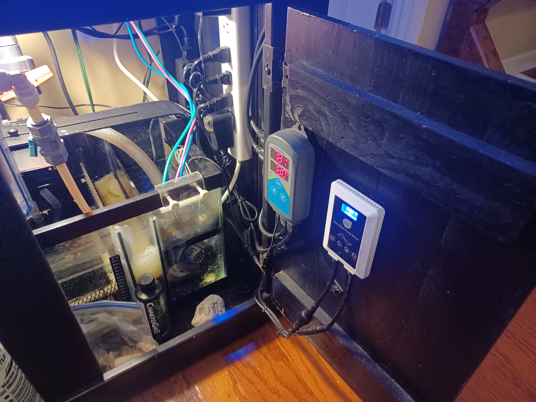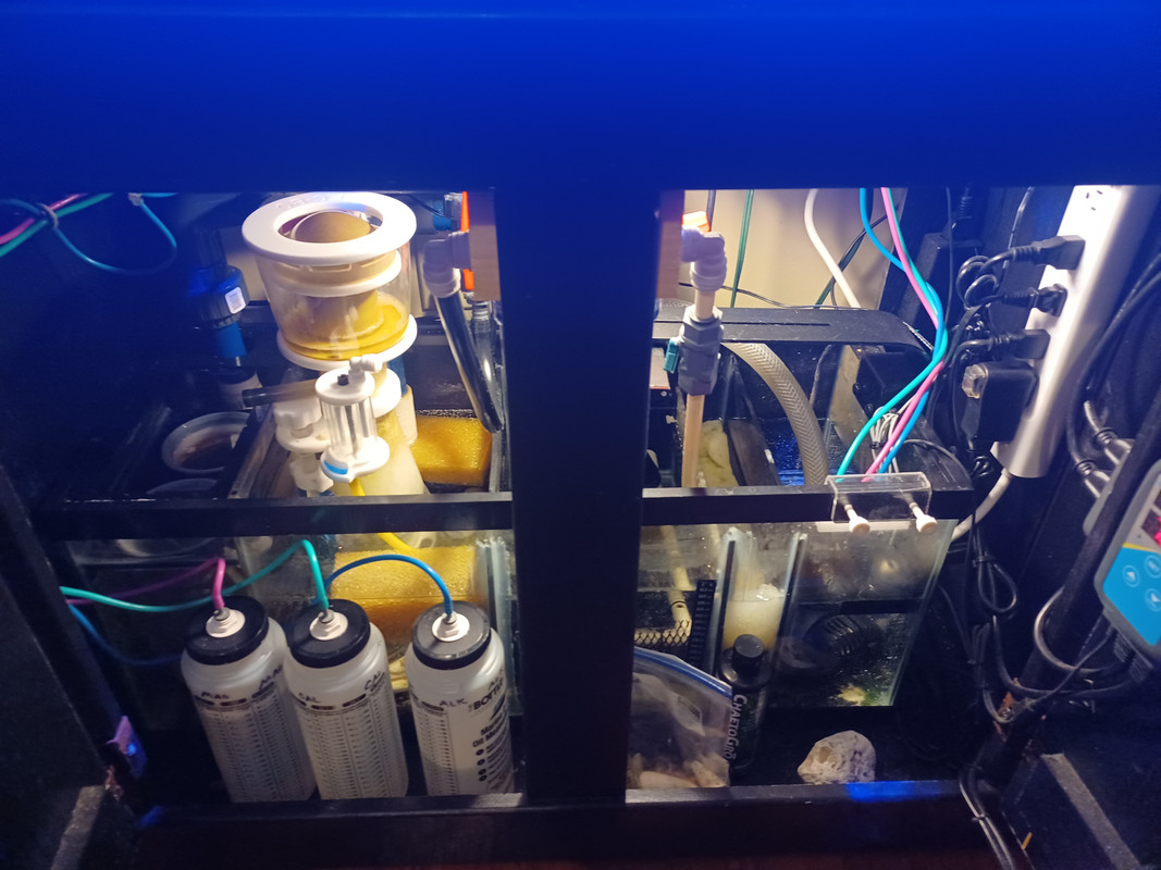Left to right, return dumps in and flows into two socks. Then 80 gallon protein skimmer. Then chaeto chamber with chaetomax light, floss filter, then return pump. There is a tunze auto top off sensor (there is 5 gallon container that sits besides tank for it). 3 kamoer pumps for Calcium, Mag, and Alkalinity. Inkbird wifi dual heater and dual probe for managing temps, and then a adjustable flow return pump.
