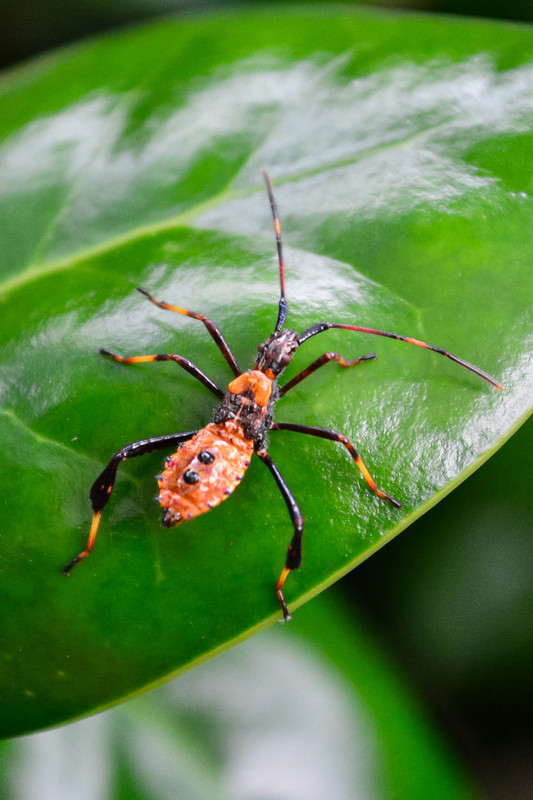 Here's a younger Eastern Leaf-footed BugI saw a few weeks ago. It is similar to the juvenile wheel bugs, but the rear legs give it away: