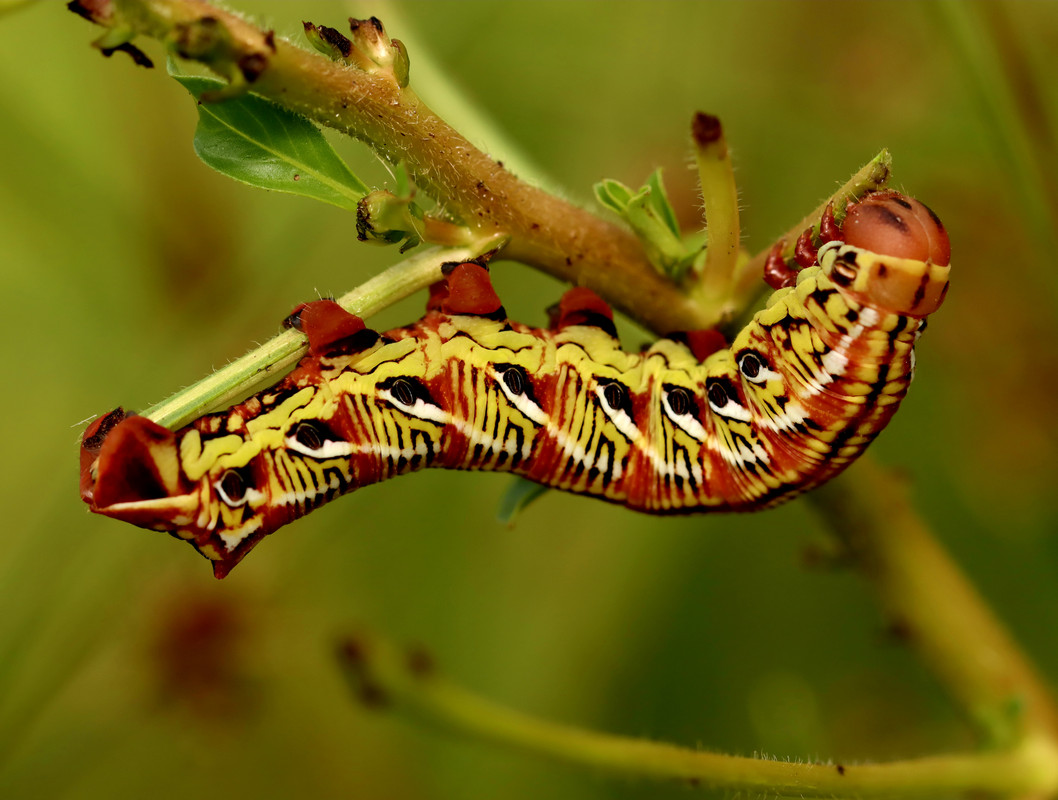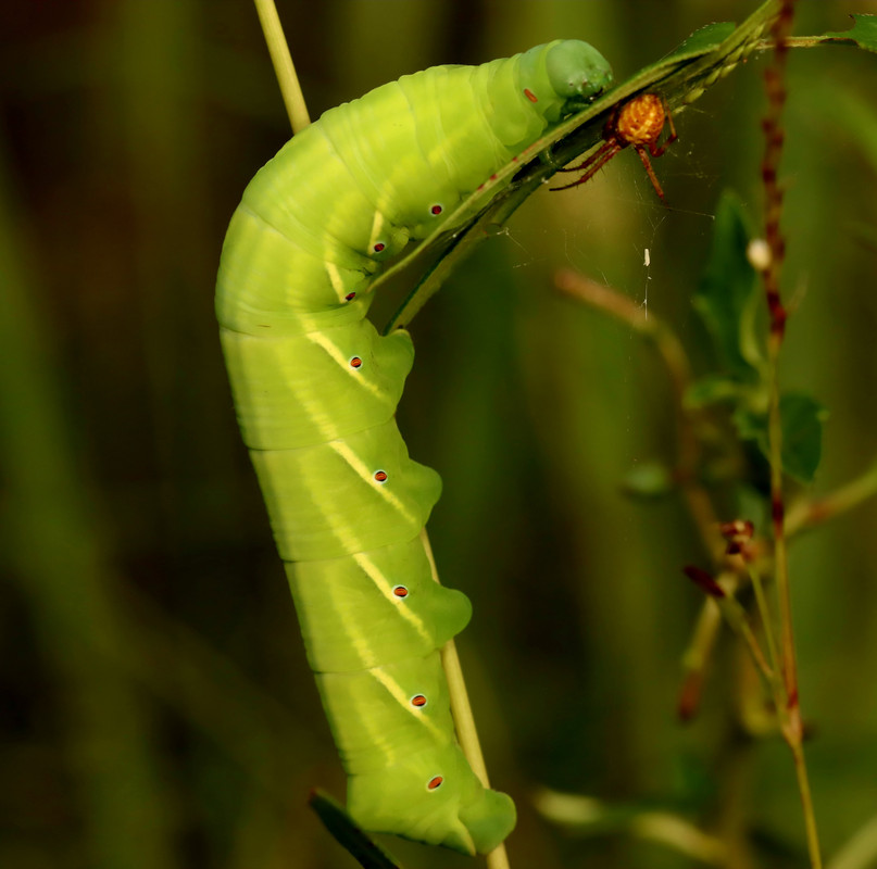 Be on the lookout for false buttonweed, catalpa, and wild coffee as host plants. They are large caterpillars, green with the black eye spots like other large moth caterpillars, but they can be brown, kind or red, and pretty variable depending on where they are found.